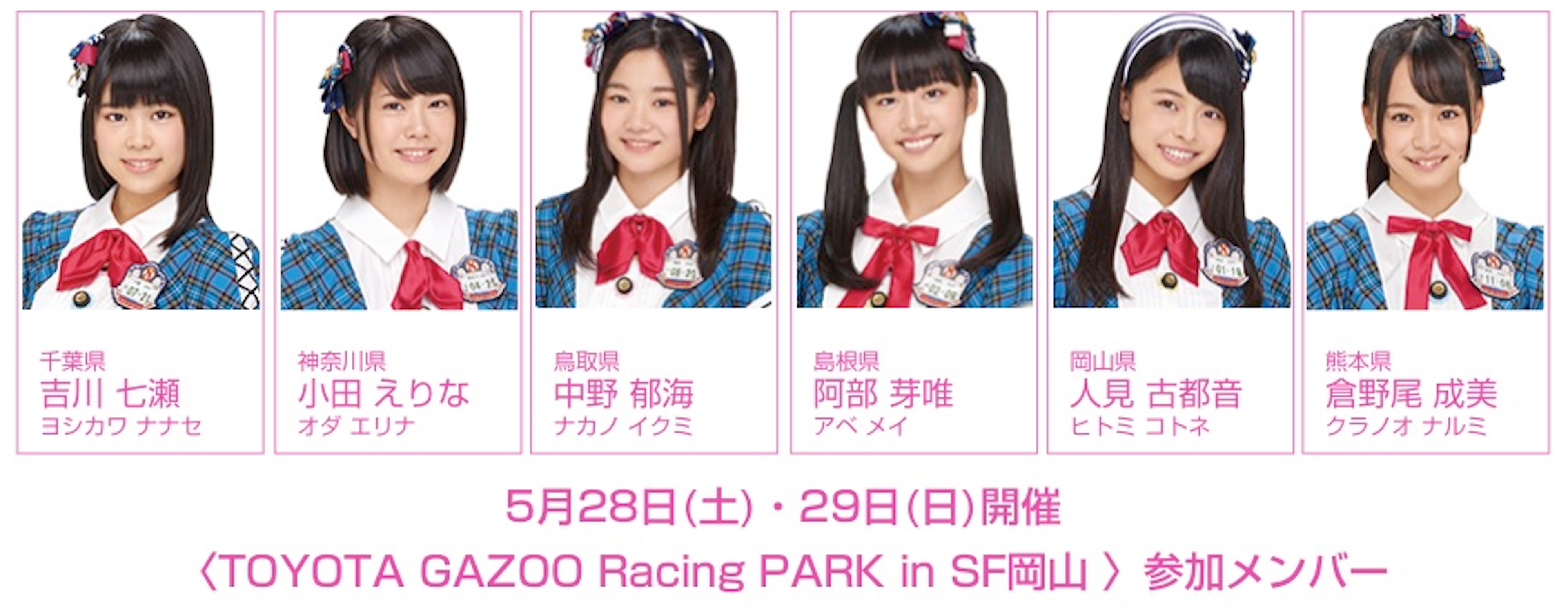 อีเวนต์: TOYOTA GAZOO Racing PARK in SF Okayama (จ.โอกายาม่า) วันที่: 2016/5/28, 2016/5/29 เมมเบอร์ (จากจังหวัด): Yoshikawa Nanase (Chiba), Oda Erina (Kanagawa), Nakano Ikumi (Tottori), Abe Mei (Shimane), Hitomi Kotone (Okayama), Kuranoo Narumi (Kumamoto)
