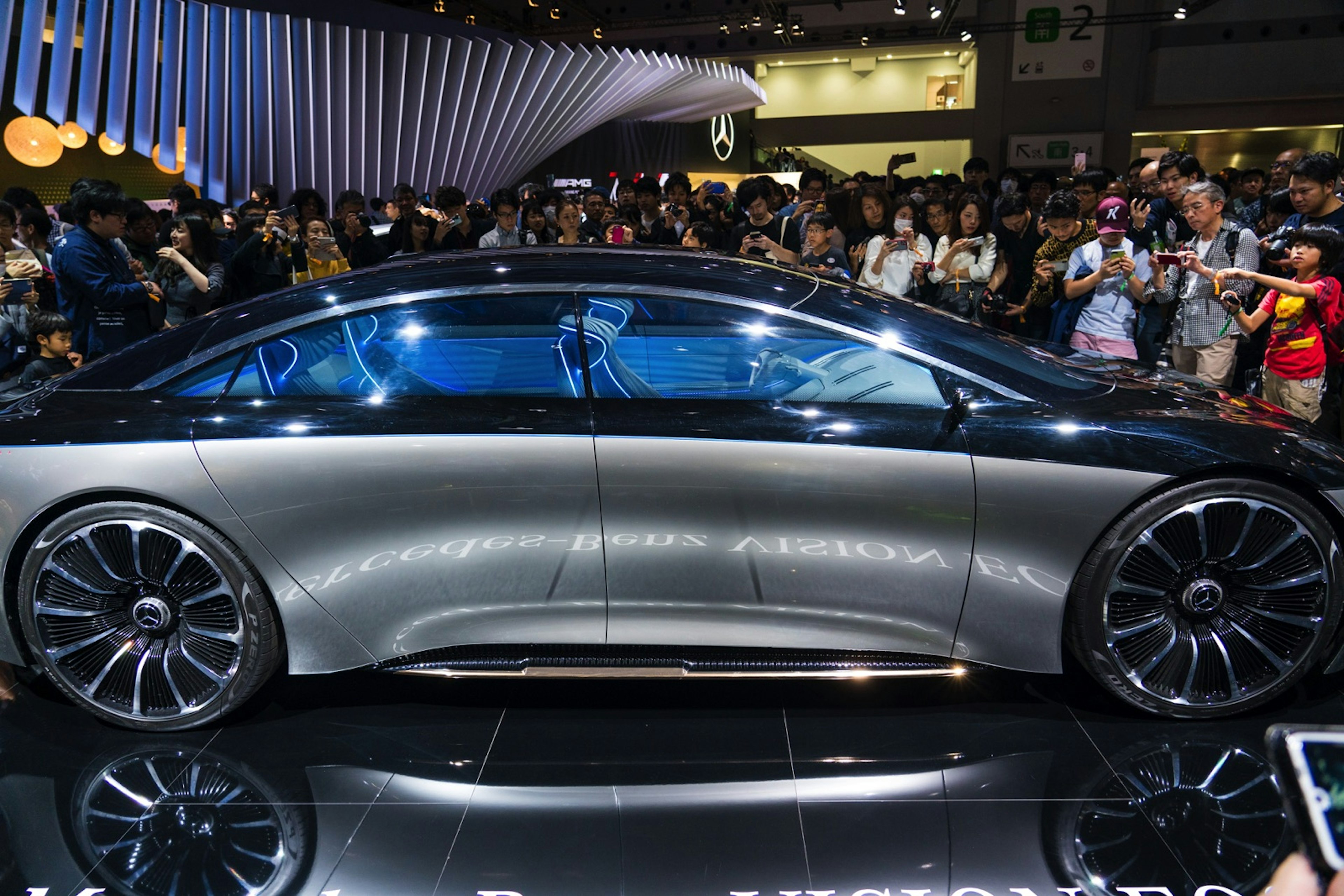ข้างล่างนี่เป็นพระเอกของงาน Mercedes-Benz VISION EQS รูปทรงโฉบเฉี่ยวเฟี่้ยว เท่ได้ใจจริงๆ คนถ่ายรูปเพียบ
