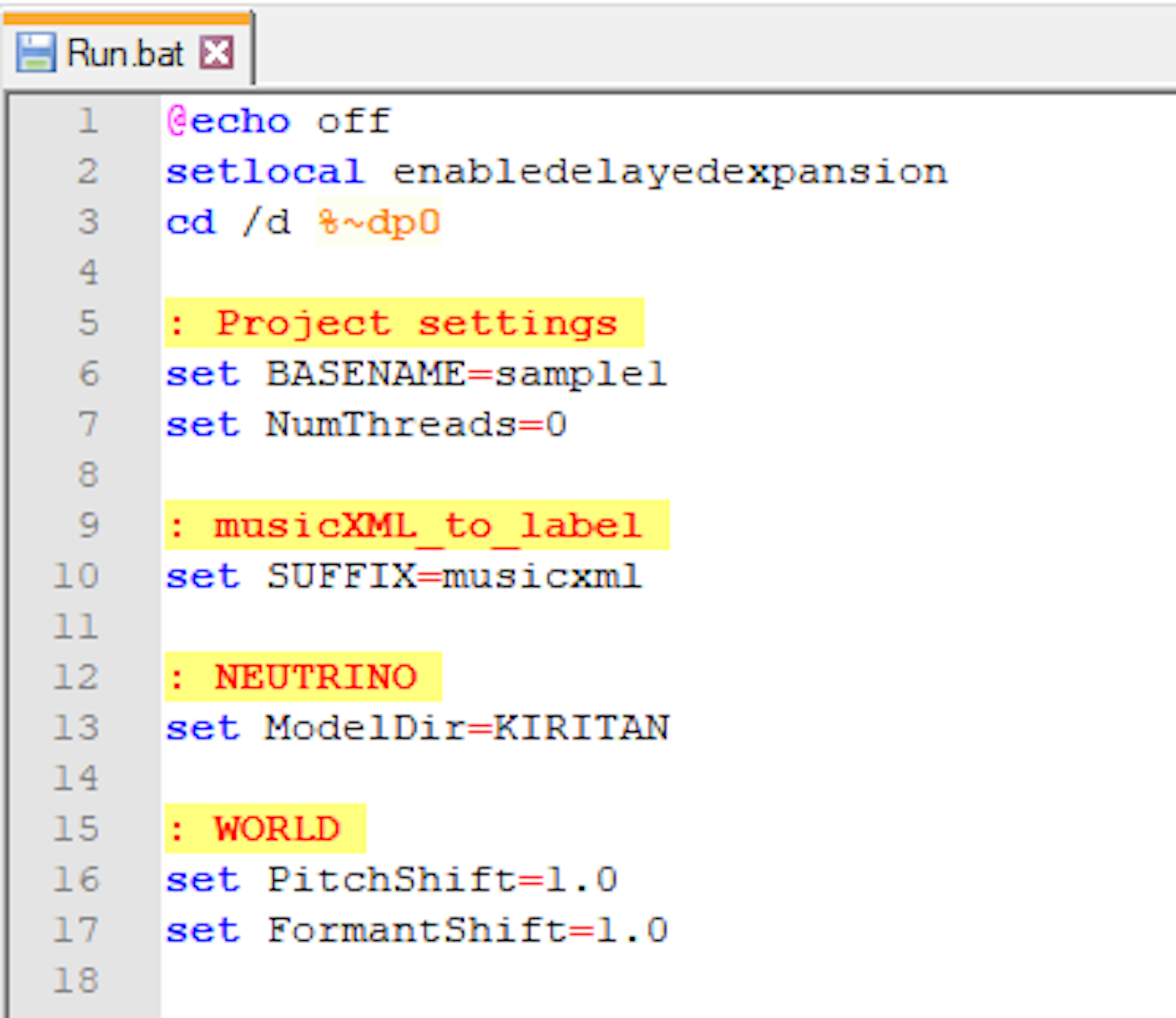 BASENAME=sample1เปลี่ยนเป็นชื่อไฟล์.musicxmlที่เราเตรียมModelDir=KIRITANเปลี่ยนเป็นYOKOเพื่อใช้เสียงอีกตัวละครได้