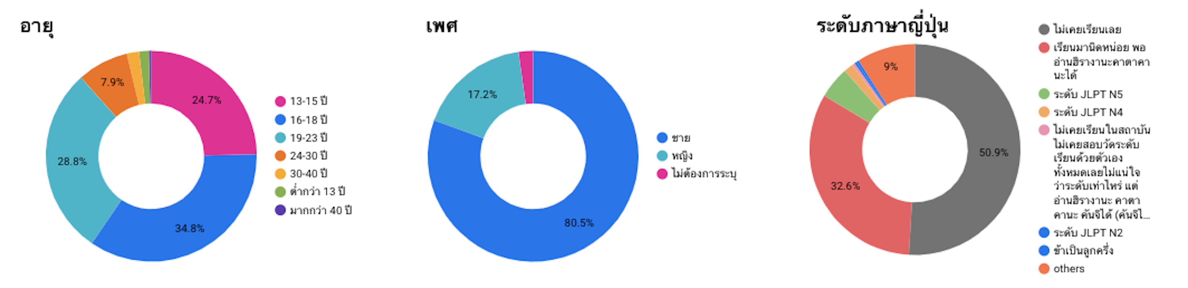 - ข้อมูลจากแบบสอบถามบ่งชี้ว่าคนดูกว่า 80% แทบไม่ได้ภาษาญี่ปุ่นเลย