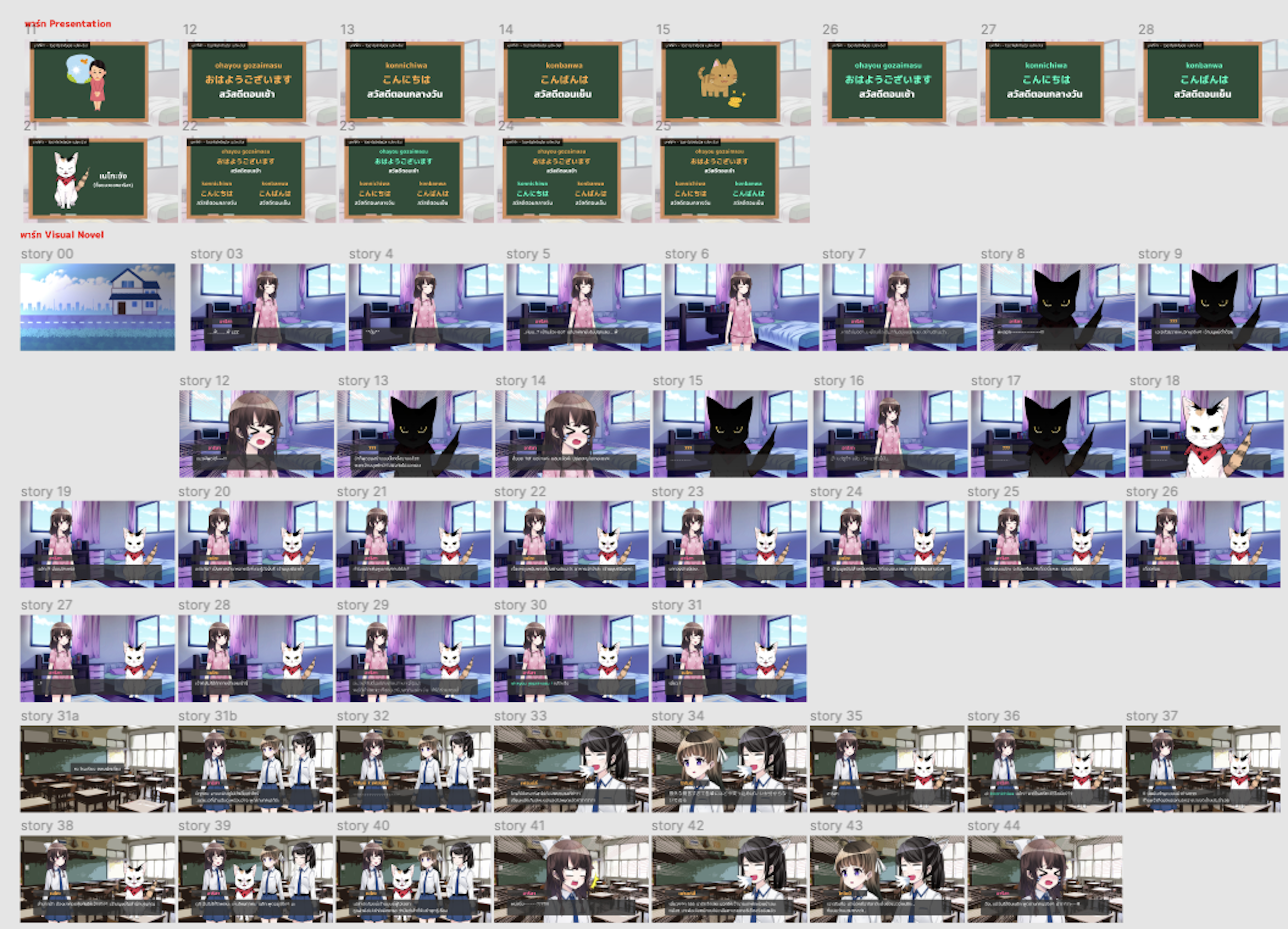 อย่างที่เห็นในคลิปว่าเราทำ Visual Novel เป็นคอนเทนต์หลัก สไลด์ใช้ภาพเดิมๆ แค่เปลี่ยนตัวละครกับตัวอักษร ตอนแรกลองทำใน Google Slide แล้วปรากฏว่าแก้ยาก เปรียบเทียบหลายหน้าพร้อมกันไม่ได้ จะแก้ภาพทีก็ต้องแก้ทุกหน้าอีก ซึ่งพอเป็น Figma เราสามารถสร้าง Component ได้ แก้ที่ Master ทีเดียว ทุกสไลด์ก็จะเปลี่ยนตามหมด และยัง Export เป็นไฟล์ .png แยกเลเยอร์พื้นใสให้นำไปใช้ตัดต่อได้โดยง่ายด้วย (ที่เห็นอาริสาสั่นๆ ก็ใช้วิธีนี้ทำเอา 555)