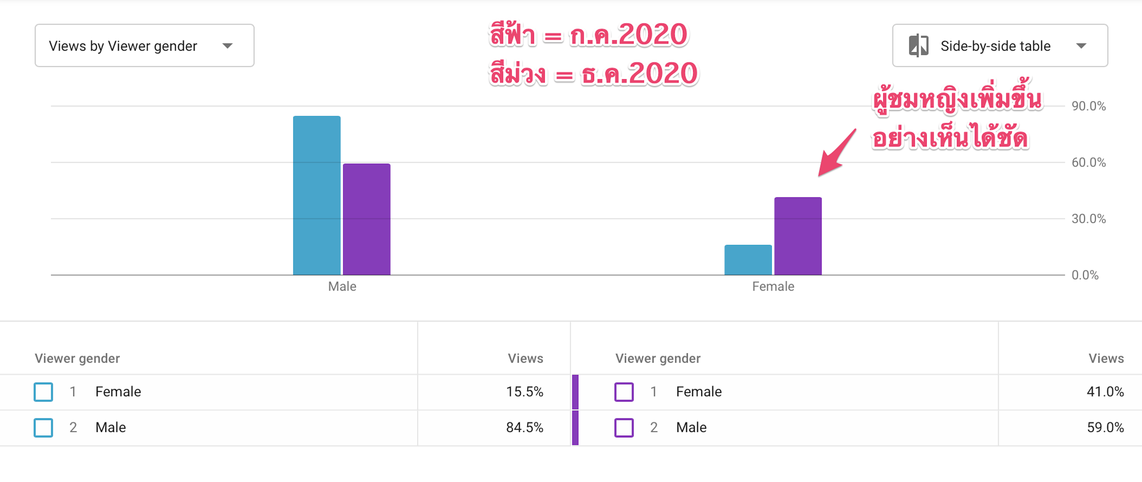ความเปลี่ยนแปลงของ Traffic Source ทำให้กลุ่มผู้ชมเปลี่ยนแปลงด้วยเช่นกัน ที่ชัดเจนที่สุดก็คือจำนวนผู้หญิงที่เพิ่มขึ้นอย่างเห็นได้ชัด จาก 15.5% ในเดือนก.ค. เป็น 41.0% ในเดือนธ.ค. คาดว่าผู้ชมกลุ่มนี้คือกลุ่มที่เซิร์ชคีย์เวิร์ดเกี่ยวกับการเรียนการสอนภาษาญี่ปุ่น จึงสรุปได้ว่าช่องอาริสาได้รับการยอมรับจาก YouTube ว่าเป็นช่องสอนภาษาญี่ปุ่นที่มีอิทธิพลมากพอสมควร และกลุ่มผู้ชมกลุ่มนี้ก็เป็นกลุ่มที่ทีมงานเล็งเป็นเป้าหมายตั้งแต่แรกแล้วด้วย ดีใจมากๆ ครับ 😭